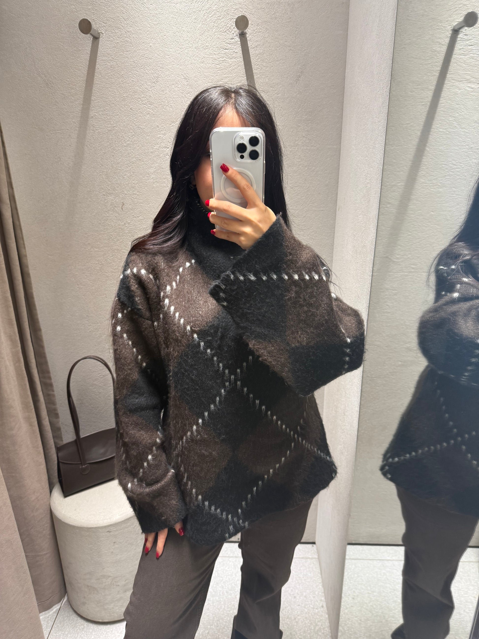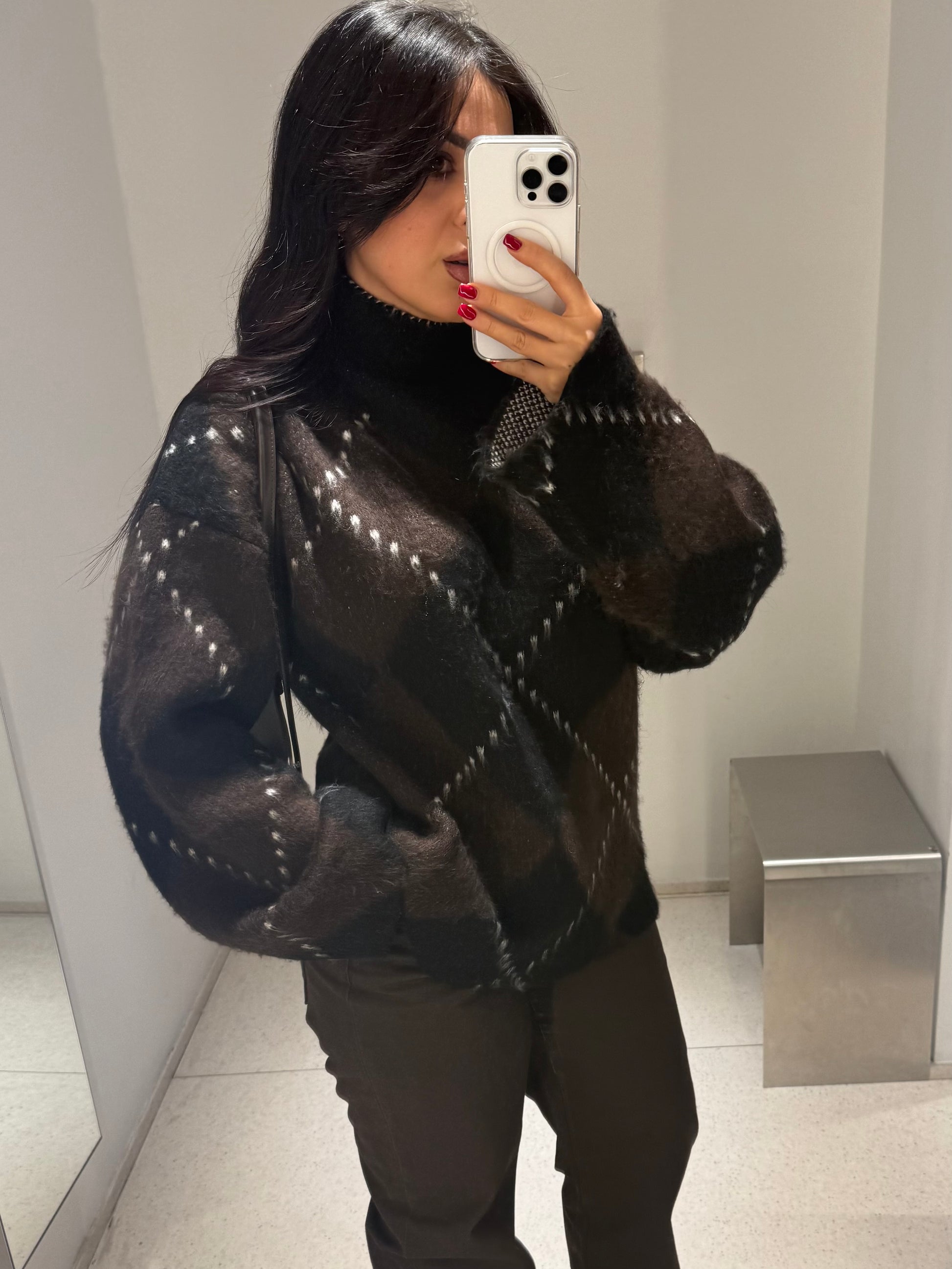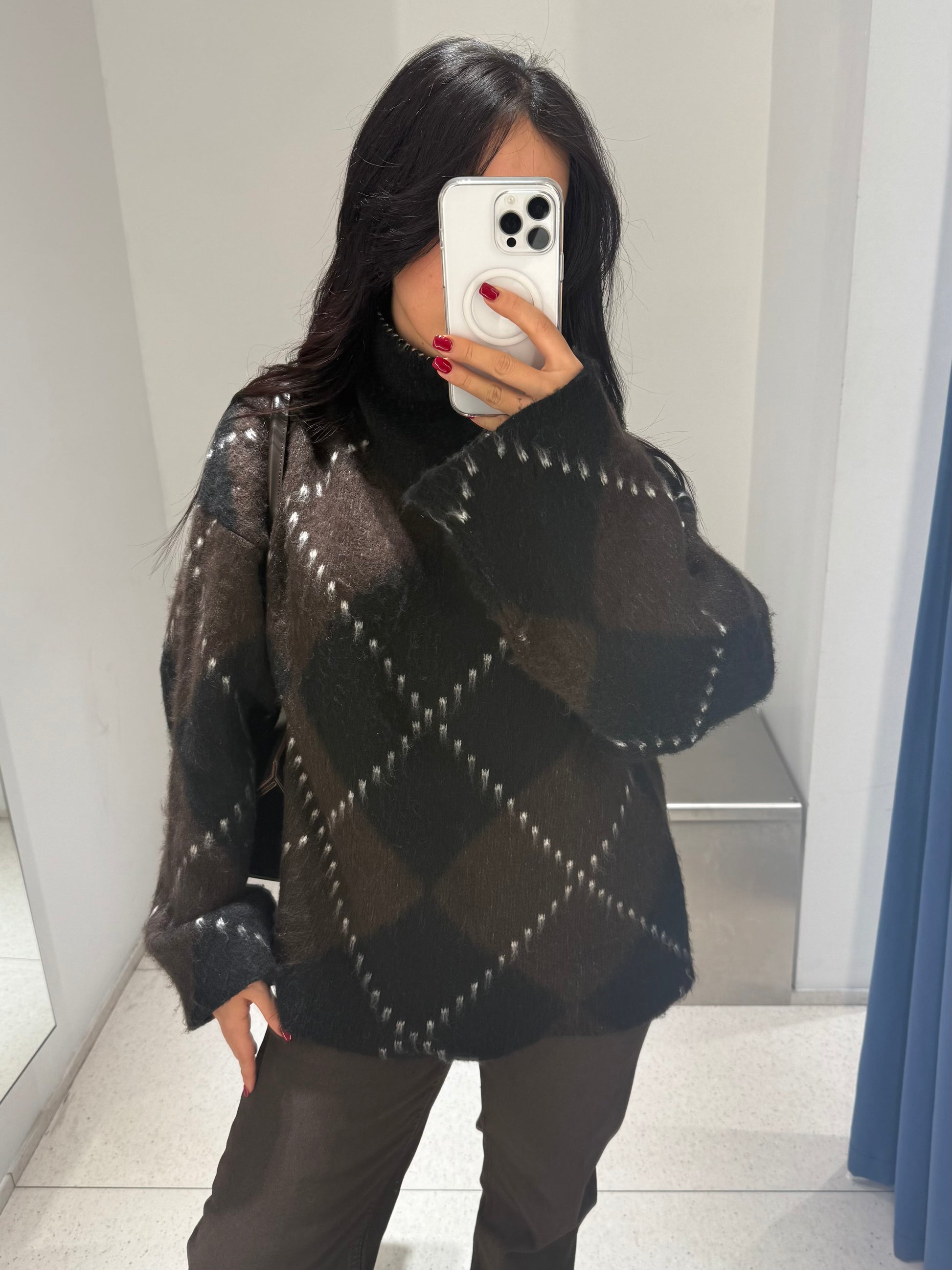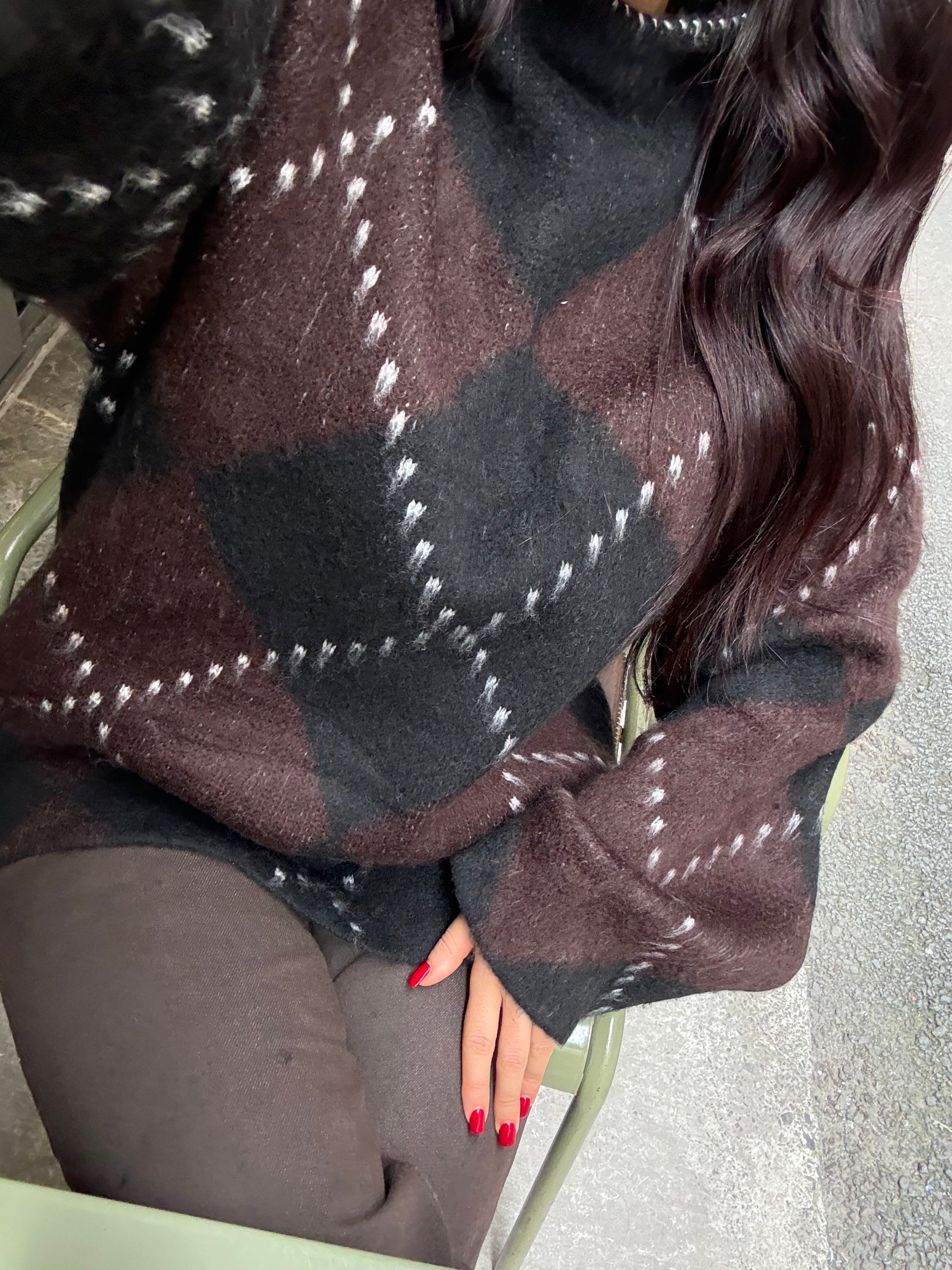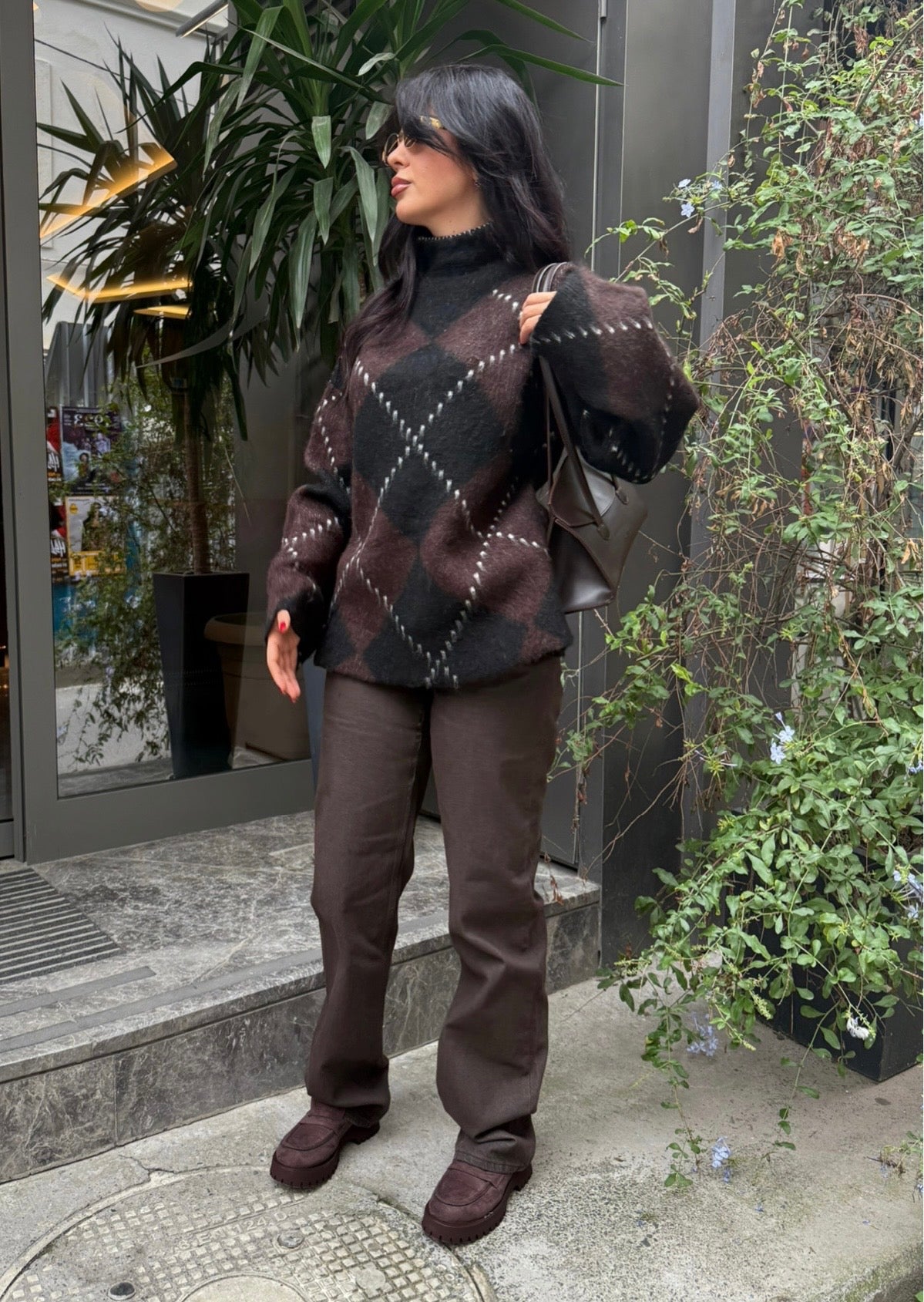 KAHVERENGİ DİK YAKA BAKLAVA DESENLİ KAZAK